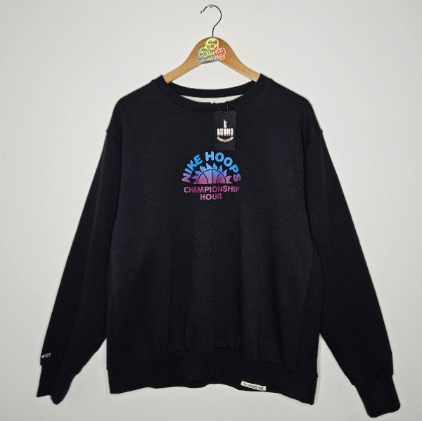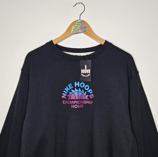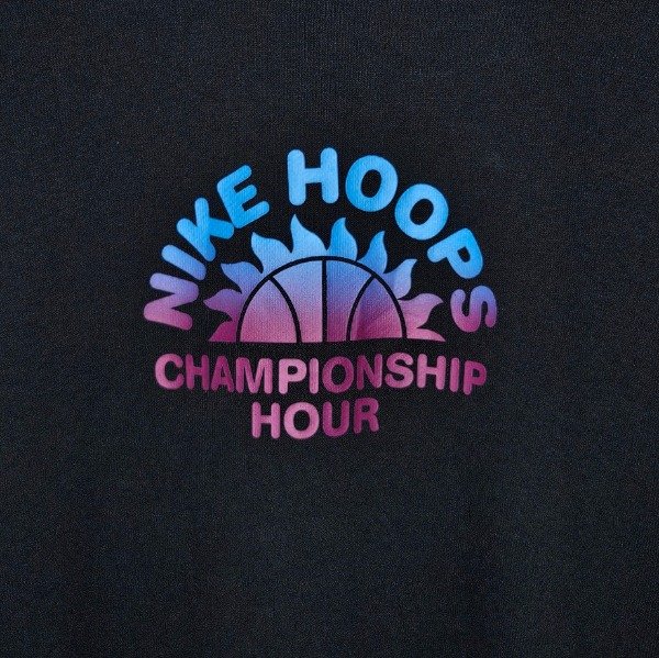 • Presenta un gráfico grande en el pecho con el texto "NIKE HOOPS CHAMPIONSHIP HOUR" en un degradado de colores azul, rosa y morado, junto con un diseño de un amanecer/puesta de sol con un balón de baloncesto.