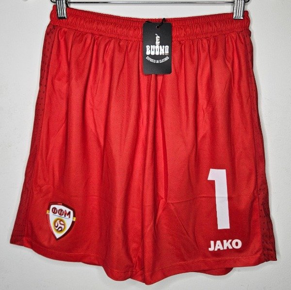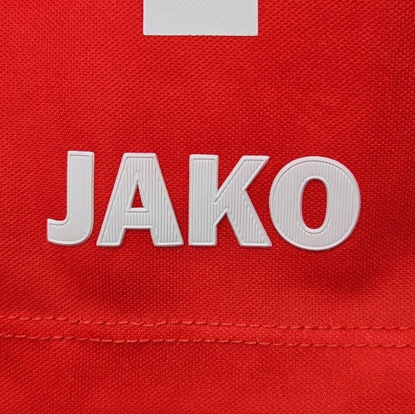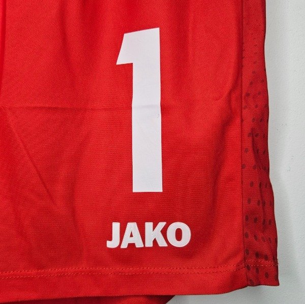 • Modelo de la equipación local (Home) en color rojo, con el escudo de la federación en una pierna y el logotipo de Jako con el número de jugador en la otra.